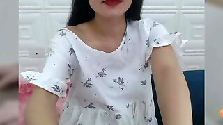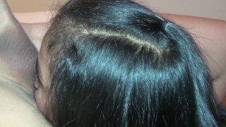 un sottile cinese fidanzata con breve scuro-color capelli è strofinato con un elettrico massaggio macchina e dà un fellatio